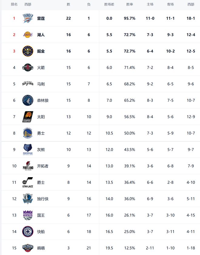 今日比赛后湖人、掘金、火箭排名互换,国王、快船排名互换,其他西部球队排名不变。